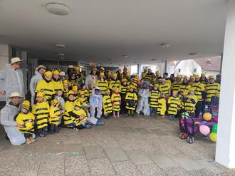 Nach 2 Jahren Pause durften die Kinder endlich wieder am Faschingssamstag durch die Straßen ziehen. Unser Motto dieses Jahr war Bienen und Imker. Und es schwirrten über 100 Bienen und Imker aus, um jede Menge Süßigkeiten an die viele Besucher des Kinderumzugs zu verteilen. In leuchtend gelb waren wir gut zu erkennen und bedanken uns bei allen Kindern, Eltern und Erzieherinnen für die zahlreiche Teilnahme, das gemeinsame Basteln hat viel Spass gemacht