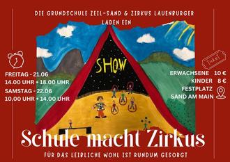 Eine Woche lang werden die Kinder der Grundschule Zeil - Sand nicht rechnen, lesen, schreiben, sondern in die Welt des Zirkuslebens eintauchen. Klassen- und Jahrgangsstufenübergreifend wird jongliert, geturnt und so mancher lustiger Clownact einstudiert. Am Ende der Woche dürfen dann groß und klein, alt und jung die Fähigkeiten der jungen Artisten in den vier Vorstellungen bestaunen. Für das leibliche Wohl wird vom Elternbeirat bestens gesorgt...