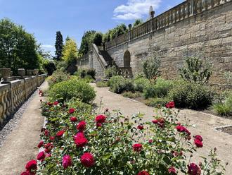 Auch die Außenanlagen der Schlossanlage haben historisches Flair! Das Schloss auf dem Hügel überragt das Dorf. Davor die eindrucksvollen Freitreppen- und Terrassenanlagen aus Sandstein, die den Blick über die Parkanlage mit dem alten Baumbestand freigeben. Geplant haben soll den Garten Carl Eduard Adolph Petzold (1815-1891), der auch in Diensten von Fürst Pückler europaweit solche Gestaltungsprinzipien verwirklicht hat.