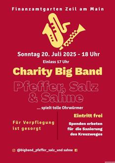 Die Charity-Bigband aus Hofheim wird am Sonntag, dem 20. Juli um 18 Uhr im Finanzamtgarten in Zeil wieder wunderbare Ohrwürmer spielen und für eine tolle Atmosphäre sorgen. Bei freiem Eintritt kommt der Spendenerlös der Konzertbesucher in diesem Jahr der Sanierung des Kreuzweges zugute. Bereits zum vierten Male tritt das Orchester mit 21 Musikern und Musikerinnen plus 3 Sängerinnen für einen guten Zweck im Zeiler Finanzamtgarten auf. Seit Gründung der Bigband vor 19 Jahren erspielte diese schon annähernd 100 000 Euro für soziale Einrichtungen und schwere Einzelschicksale. Dafür werden berühmte Klassiker der Popgeschichte mit eigenen Arrangements von Bandleader Wolfram Hirsch geboten. Den Zuhörern bietet sich der abwechslungsreiche Hörgenuss zwischen den berühmten Originalen und den „eigenen Noten“ der Bigband.