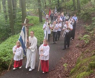 Nach dem Heimatabend in der Sennhütte traf man sich dann zur Wallfahrt am Sonntag am Rübezahlparkplatz. Unter Wallfahrtführung von Dieter Köpf ging die doch schon kleine Wallfahrerschar zum Käppele, wo der Gottesdienst im Freien stattfand. Pfarrer Michael Erhart fand wieder gefühlvolle Worte in seiner Predigt zur besonderen Situation der Vertriebenen, ist er doch selbst in der Familie betroffen. Nicht zuletzt ist die Schubert Messe seit 1948 fester Bestandteil des Gottesdienstes, was die besondere Bedeutung dieses Wallfahrtsgottesdienstes ausmacht.