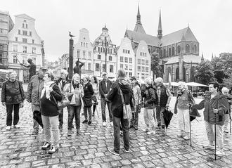 Am zweiten Ausflugstag, pünktlich zur Führung in der Hansestadt Rostock, überraschte ein heftiger Regenguss die fränkischen Besucher, so dass man „Zuflucht“ in einem ehemaligen Kloster nehmen musste, wo dann die Geschichte der Hansestadt erklärt wurde. Nach dem großen Regen gab es einen Rundgang durch die Stadt. Zuerst ging es durch die Kröpelinstraße mit ihren vielen traditionsreichen Giebelhäusern bis zum Marktplatz, der leider bei Bombenangriffen im Jahr 1942 zu großen Teilen zerstört wurde. Das wuchtige Steintor und das filigrane Rathaus sind glücklicherweise stehen geblieben.