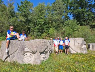 Über den Mausberg rollten wir zum stillgelegten Steinbruch im „Klaubholz“, im Bischofsheimer Forst. Die gewaltige Dimension der dort gelagerten Steinblöcke ist beeindruckend. Im schattigen Wald ließen wir die Räder ins kühle Ebelsbachtal laufen. Via Neubrunn ging es hoch und rechts ab zum kreativ gestalteten Kreuzweg bei Breitbrunn. Die anschaulichen Stationen nutzten wir gerne zum Innehalten.