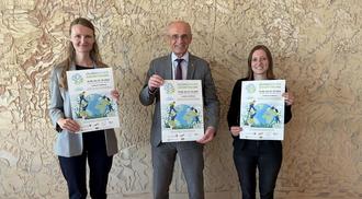 Klimaschutzmanagerin Nora Gnilke, Landrat Wilhelm Schneider und Regionalmanagerin Sonja Gerstenkorn laden zum Besuch der Erlebniswochen Zukunftsklima ein.