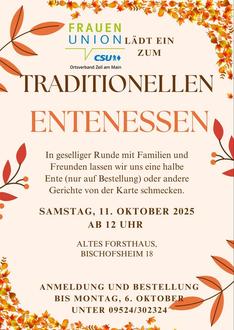 Die Frauen Union und der CSU-Ortsverband Zeil laden zum „Traditionellen Entenessen“ ein. Der Termin ist Samstag, 11.10.2025 ab 12:00 Uhr im „Alten Forsthaus“ in Bischofsheim. Vorherige Anmeldung und Bestellung bis Montag, 06.10.2025 unter Tel-Nr. 095 24 – 302324 ist zwingend erforderlich.