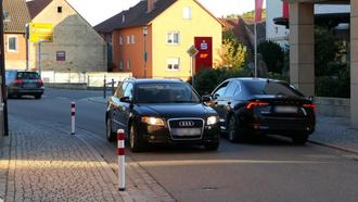 "Die Fahrbahnbreite hat sich nicht geändert und hat hier exakt die gleichen Maße wie an der Engstelle beim Marktplatz in Höhe der Bürgerstube", stellte Bürgermeister Stadelmann die Tatsachen klar. Die Pfosten berühren nicht einmal die gepflasterte Abflussrinne der Straße. Sinn und Zweck des Ganzen ist mehr Verkehrssicherheit für Fußgänger, insbesondere Kinder und gehandicapte Personen mit Rollator oder Rollstuhl. Massive Beschwerden über Verkehrsteilnehmer, die auf den Gehweg ausweichen und so Gefahrensituationen herbei führen, häuften sich in letzter Zeit auf dem Schreibtisch des Bürgermeisters.