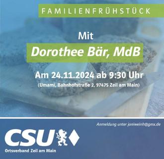 Der CSU-Ortsverband und die Frauenunion Zeil laden alle Bürgerinnen und Bürger am Sonntag, den 24. November 2024, zum traditionellen Familienfrühstück in die Gaststätte „Umami“ ein. Los geht es um 9:30 Uhr, und willkommen sind nicht nur CSU-Mitglieder, sondern auch alle Interessierten aus Zeil und der Umgebung.