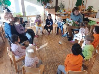Dem Alter entsprechend wurden von den Erzieherinnen Bilderbücher für die Kinder ausgesucht, entscheiden konnten sie dann selbst, welche Geschichte sie hören wollten. Es wurden Kuscheltiere, Handpuppen, Kamishibais, Bilderkarten... eingesetzt, um die Erzählungen anschaulicher zu gestalten. Alle Kinder waren voll bei der Sache und hatten viel Spaß dabei.