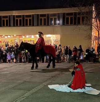 Die Krippenkinder starteten am Caritashaus. Nach einem Rundgang um die Kirche kam die Gruppe im Schulhof an, wo St. Martin mit dem Bettler seinen Mantel teilte.