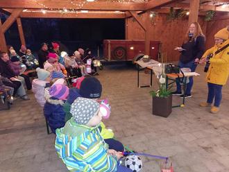 Zu Beginn stimmte Pastoralreferentin Sandra Lohs die ca. 30 Kinder mit ihren Eltern, Großeltern und Freunden ein, um anschließend mit ihren selbstgebastelten, bunt leuchtenden Laternen hinter dem St. Martin zu Pferd durch das Dorf zu ziehen.