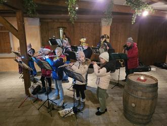 Die Bläserkids der lustigen Dorfmusikanten eröffneten die Veranstaltung mit fröhlichen Melodien, die alle in eine festliche Stimmung versetzten. Der geschmückte Festplatz, vorbereitet von den engagierten KGV-Mitgliedern, erstrahlte in weihnachtlichem Glanz.