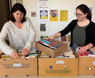 Lena Vondran und Silke Wittig bereiten die Räume der Stadtbibliothek auf die anstehenden Umbaumaßnahmen vor, die am Montag, den 26. Februar, beginnen.