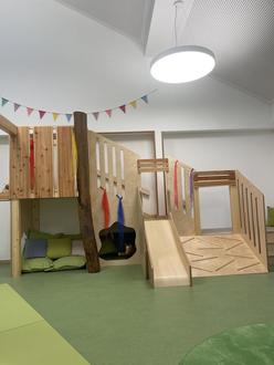 Die Kinder haben jede Menge Platz zum Toben, sowohl auf den durchdacht gestalteten Außenflächen als auch im Inneren. Die Kinderkrippe bietet auf einer Fläche von ca. 650 m² Platz für vier Krippengruppen, die OGS umfasst rund 270 m². Mit fast 50 Krippen- und 60 OGS-Plätzen setzt das Caritas-Haus neue Maßstäbe in der Kinderbetreuung.