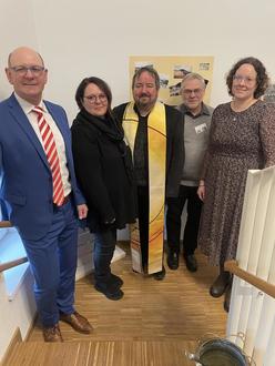 Über die Einweihung des Caritashauses freuen sich (von links): Bürgermeister Thomas Stadelmann, Kindergartenleiterin Susanne Bös-Naumann, Pfarrer Michael Erhart, Dietmar Herrnleben (Vorsitzender des Caritasvereins) und Diana Klüh (Leiterin der Mittagsbetreuung).
