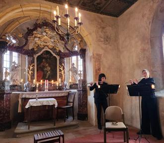 Ute Wolf und Monika Schraut spielen im stimmungsvollen Ambiente der Annakapelle zeitgenössische Musik.