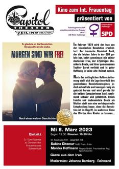 Das Kino zum Weltfrauentag am 8. März im Zeiler Capitol ist ein Termin, der mittlerweile Tradition hat. Auch in diesem Jahr hat Initiatorin Johanna Bamberg-Reinwand zusammen mit Bruno Schneyer wieder einen tollen Film ausgesucht. In "Morgen sind wir frei!" wird die Geschichte einer europäisch-iranischen Familie erzählt. Der Abend startet um 19.00 Uhr mit einem Sektempfang und landestypischen Kleinigkeiten zu Essen, die von einer Gruppe Frauen um Monika Hoffmann vorbereitet werden.
