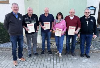 Die Vorstände Dietmar Herrnleben (rechts) und Norbert Strätz (links) freuen sich mit den Geehrten: (v.l.) Josef Fenzl (40 Jahre), Fredy Fenzl (40), Elisabeth Kernwein (25) und Günter Hetterich (40)