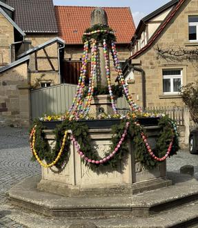 Der Haßberg-Verein Zeil a.Main verschönert seit vielen Jahrzehnten den „Oster“-Brunnen in der Speiersgasse. Wie jedes Jahr mobilisierte Petra Schumann wieder zahlreiche engagierte Helfer und ging ans Werk. Zuerst wurden geschickt Girlanden aus Zweigen von Nadelhölzern gebunden, bevor am nächsten Tag mit der kunstvollen Dekoration begonnen wurde. „Ein herzliches Dankeschön geht an Alexander und Daniel Brunner für die Wedel“, betonte die Vorsitzende Gabi Stahl.