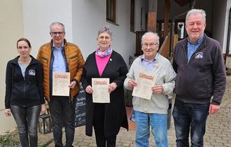 Anschließend wurden zur besonderen Freude des Vereins Andreas Lindner, Petra Geisel, Horst Fella und Gerhard Kernwein für 40 Jahre Vereinsmitgliedschaft mit Urkunde und goldener Vereinsnadel durch Norbert Strätz und Natascha Baumann ausgezeichnet.