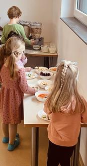 In unserem neuen „Strolchen-Bistro“ werden wir uns das Frühstück vom Buffet, das frische gekochte Mittagessen und den Nachmittags-Snack schmecken lassen. Wir streben an, Lebensmittel aus der Region und der Saison entsprechend anzubieten... wir finden es toll und freuen uns soooo sehr darauf!!! :-)