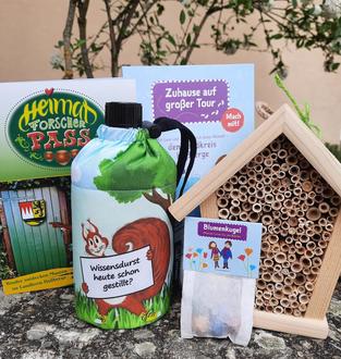 Gemeinsam haben Kulturstelle und Regionalmanagement des Landkreises Haßberge zwei spannende Angebote entwickelt, die kleine und große Entdecker dazu animieren, die Region zu erkunden. Zum einen gibt es den Heimatforscherpass. Das neugierige Eichhörnchen Emil lädt dazu ein, verschiedene Museen im Landkreis Haßberge zu besuchen und Spannendes aus der Heimatgeschichte zu erfahren. Jeder Museumsbesuch wird mit einem Wissensnuss-Aufkleber belohnt. Schon mit vier Wissensnüssen ist der Pass gefüllt. Wer ein Foto des vollständigen Passes per E-Mail an kulturraum@hassberge.de einreicht, wird als echter Heimatforscher ausgezeichnet und erhält als Belohnung eine Urkunde und eine bunte, praktische Emil-Trinkflasche.