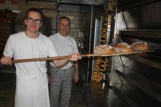 Emilio Keil (li) hat die Gesellenprüfung für das Bäcker-Handwerk als Innungsbester mit der Gesamtnote Eins bestanden und strebt als nächstes Ziel die Meisterprüfung an. Im Hintergrund ein stolzer Chef, Fritz-Erwin Stapp.