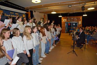 Sehr geschickt hatte Alexander Th. Link das Programm zusammengestellt, sodass eher leise Melodien von rockigen Titeln abgelöst wurden, bei denen das Publikum begeistert mitklatschte oder wie bei „Children of the earth“ das Stampfen von mehr als 50 Sängern und Sängerinnen das Gebäude erbeben ließ. Insbesondere bei bekannten Liedern wie „Go west“ oder „Ich möchte‘ so gerne Dave Dudley hören“ übertrug sich die Begeisterung der Chöre auf das Publikum. In diesen Momenten wurde das Besondere an den Konzerten von Alexander Th. Link deutlich: Es sind Konzerte „zum Anfassen“. Das Publikum spürt Unsicherheiten, die Aufregung, aber vor allem die große Begeisterung und das musikalische Können der vielen Schüler und Schülerinnen viel intensiver, als es bei einem „normalen“ Konzert der Fall ist. So bedankte sich das Publikum für einen wirklich gelungenen Abend mit einem lang anhaltenden Applaus. Für die Schulleitung der Ernst-Göbel-Schule dankte Matthias Trumpfheller Alexander Th. Link für den tollen Abend und unterstrich die Bedeutung der Konzerte für die Ambitionen der Ernst-Göbel-Schule, offizielle Kulturschule zu werden, ein Prädikat, das das Hessische Kultusministerium an diejenigen Schulen vergibt, die sich im kulturellen Bereich besonders engagieren.