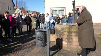 Am 18. März traf sich wie jedes Jahr eine größere Gruppe Breuberger Bürger am alten Markt in Neustadt zum Gedenken an die Deportation der beiden letzten jüdischen Familien in Neustadt, Kempe und Marx, im Jahr 1942. Rainer Jakobs vom Vorstand der Bürgerstiftung begrüßte die Gruppe und bedankte sich für ihr Kommen, besonders bei den Schülern und Schülerinnen der 7. Klasse der GAS, die wieder mit Pfarrer Jekel gekommen waren, um die acht Stolpersteine am alten Marktplatz und vor dem Wartehäuschen zu reinigen und zu polieren.