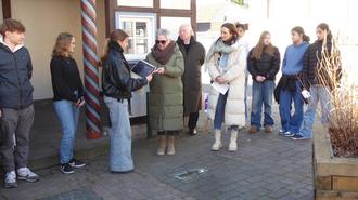 Im letzten Jahr hatten Schüler und Schülerinnen der Klasse 10G mit ihrer Geschichtslehrerin Hanna Reus ihr Projekt Stolperstein vorgestellt. Die Projektgruppe hatte im Stadtarchiv in Neustadt die Unterlagen über die beiden Familien gesichtet und stellte ihre Ergebnisse in zwei Präsentationen vor. Das Material aus diesem Projekt sollte später über einen QR-Code direkt zugänglich gemacht werden.