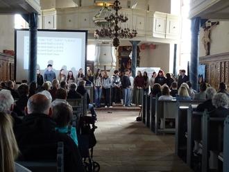 In ihrem Vorstellungsgottesdienst haben sich die diesjährigen 20 Konfirmandinnen und Konfirmanden mit dem Thema Abendmahl auseinandergesetzt. Dazu erinnerten sie an die Ursprünge des Abendmahls im jüdischen Pessachfest und hatten die dortigen Symbolspeisen zusammengestellt und erklärt. Ein selbstgedrehtes Video zeigte am Beispiel der Geschichte vom verlorenen Sohn, wie Gott uns wie ein liebender Vater die Hände reicht. Auch im Abendmahl erfahren wir diese Vergebung. Beim Blick auf das „letzte Abendmahl“ Jesu mit seinen Jüngern wurde deutlich, dass Jesus auch gemeinsam mit denen, die ihn später verraten werden, Brot und Wein teilt. Der Abendmahlstisch ist für alle offen und verbindet uns als Gemeinschaft der Christinnen und Christen über die Zeiten hinweg. Im Abendmahl geht es auch um die Gastfreundschaft Gottes. Die Jugendlichen überlegten anhand konkreter Beispiele, wie Gastfreundschaft heute aussehen kann und was dafür nötig ist, um sich Willkommen zu fühlen. Ein großes Wandbild zeigte in bunten Farben die Hoffnung und das Vertrauen auf Gottes Gegenwart bei der Feier des Abendmahls und machte deutlich, dass es sich hierbei um ein Sakrament handelt. Schließlich feierten die Jugendlichen mit der Gemeinde ein Agapemahl mit selbstgebackenem Abendmahlsbrot und Weintrauben. Zum Gottesdienst gehörten auch fröhliche Musik und ein gemeinsamer Abschluss mit Kaffee und selbstgebackenem Kuchen in der Kirche.