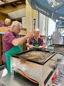 Als erstes möchten wir uns ganz herzlich bei unseren vielen fleißigen, freiwilligen Helfern und Kuchenbäckerinnen bedanken. Ohne Euch wäre unser Fest nicht möglich. Pünktlich zum Donnerstag strahlte die Sonne vom blauen Himmel. Ab 10 Uhr füllte sich der Biergarten mit hungrigen Gästen. Die gebackenen Forellen mit Kartoffelsalat oder Brot, Steackbrötchen, Paprika- und Bratwurst wurden gut verkauft. Auch an der Kuchentheke gab es großen Andrang. Bei dieser tollen Auswahl an selbstgebackenen Torten und Kuchen ist das gut zu verstehen.