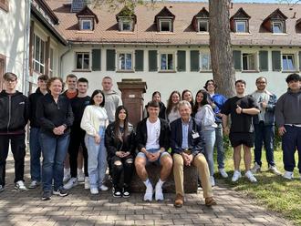 Fachbereichsleiterin Antonia Gröss (3. Von links) und Zeitzeuge Mieczysław Grochowski umringt von Schülern und Schülerinnen der Ernst-Göbel-Schule.
