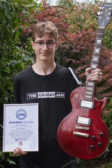 Stolz präsentiert Lukas Dingeldey seine Gitarre und die Urkunde.