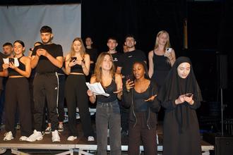 Diesmal lag der Fokus auf dem Darstellenden Spiel, das an der Schule eine besondere Wertschätzung genießt. Doch der Abend begann musikalisch mit der Klasse G10c, die in Zusammenarbeit mit ihrer Deutschlehrerin Regine Riehm und Musiklehrer Alexander Th. Link sich im Fach Deutsch mit Bertolt Brecht auseinandergesetzt hatte und einige seiner Balladen auf gekonnte Weise vortrug.