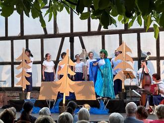 Rätselhaft beginnt auch ,,Cesaret - Sound of Rotkäppchen“ vom Theaterforum Taklit um 18:00 Uhr, nämlich mit einem Quiz zum Märchen der Gebrüder Grimm, das weit über die europäischen Grenzen bekannt ist. Mit diesem interkulturellen und generationsübergreifenden Musiktheater holt der Verschönerungsverein das erste dreisprachige Musiktheater in Hessen auf die Naturbühne.