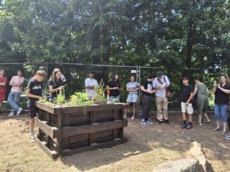 Eines der Hochbeete mit einem Teil der SchülerInnen.