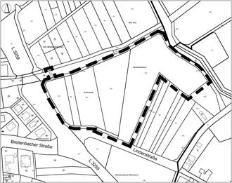 Abbildung Auszug aus dem amtlichen Liegenschaftskataster mit Eintragung der Grenze des räumlichen Geltungsbereichs der Flächennutzungsplanänderung im Bereich des vorhabenbezogenen Bebauungsplans „Am Breitenbacher Fahrweg“ in der Gemarkung Neustadt (strichlierte Umgrenzungslinie), ohne Maßstab