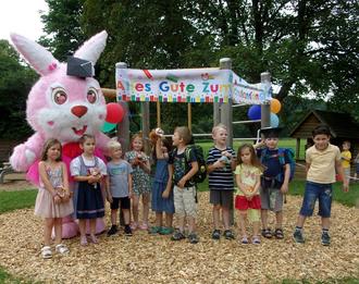 Im Anschluss daran folgte unsere Schulranzenparty. Dazu waren die Eltern der Schulkinder eingeladen, welche sich bei schönstem Sonnenschein auf dem Spielplatz voller Glück und Rührung von dem eingeübten Programm ihrer Kinder überraschen ließen. Als ganz besondere Überraschung kam ein rosa Partyhase zu unserem Abschlussfest, der gemeinsam mit uns die Eltern begrüßte und unsere eingeübten Schulkind-Lieder gesungen hat. Das war total schön und lustig! Nach einem letzten gemeinsamen Abschiedslied trugen die Schulkinder stolz ihre Schultüten und Portfolioordner mit vielen Erinnerungen nach Hause.
