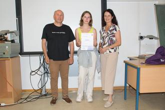Auf dem Foto freuen sich mit Malou der Fachsprecher Mathematik Markus Kreh und Schulleiterin Marion Braun.