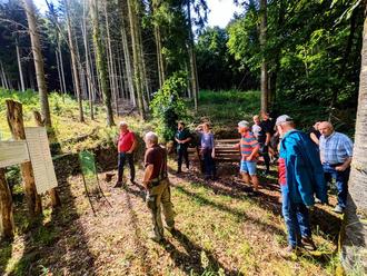 Beim nächsten Halt an einer rund ein Hektar großen Fläche berichtete Revierförster Friedl, dass es ihm schon ein bisschen mulmig war, als er sich nach dem durch Borkenkäfer bedingten Totalausfalls des Fichtenbestandes aus Kostengründen für die Naturverjüngung entschied. Denn anstatt mehrere Tausend Euro in Jungpflanzen und die anschließenden Pflegemaßnahmen zu investieren, wurde die Kalamitätsfläche der Natur überlassen. Schon bald fassten Pionierbaumarten wie die Birke Fuß, die das entstehende Brombeerdickicht durchdringen können. Die Samen von weiteren, teils in der näheren Umgebung gar nicht vorkommenden Baumarten wurden von Vögeln und Wind eingetragen, sodass nach nunmehr fünf Jahren eine erstaunliche Artenvielfalt entstand. „Die Waldentwicklung geht hier zwar langsamer voran“, so der Forstfachmann „allerdings ist der Bestand stabil und wird uns zeigen, welche Baumarten mit den Klimaveränderungen besonders gut klarkommen“.