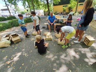 Während der Ferienspielewoche bauten die Kinder insgesamt 50 Insektenhotels – zum 50jährigen Jubiläum der Stadt Breuberg. Jedes Insektenhotel erhielt entsprechend einen Stempel mit der Aufschrift „Breuberg 50 Jahre“.