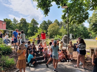 Am Mittwoch besuchte Bürgermeisterin Deirdre Heckler die Ferienspielekinder und bestaunte die tollen Insektenhotels. Zur Belohnung verteilte sie Eis an alle.