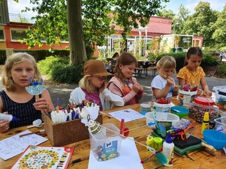 Zusätzlich gab es verschiedene Bastelangebote rund um das Thema Insekten: Libellen, Bienen, Marienkäfer und Co. konnten die Kinder aus Materialien wie Wäscheklammern, Perlen, Pfeifenputzer, Holzspieße u.ä. basteln, die in einen Blumentopf oder ins Beet gesteckt werden können.
