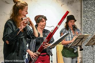 Begleitet wurde Edi von seinen 3 „Töchtern“, die mit musikalischen Einlagen mit Fagott, Querflöte und Klarinette erfreuten. Das Trio, das sich im „normalen“ Leben MIRABELL nennt. Kathrin Mayer spielte das 2 kg schwere Fagott, Karin Büchler die Querflöte und Maya Pinzolas die Klarinette. Die Noten für die anspruchsvollen Stücke, unter anderem von Bach, wurden speziell für diese Instrumentenkombination geschrieben.