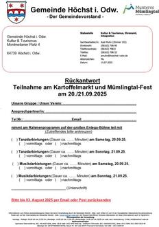 Im Rahmen des beliebten Kartoffelmarktes in Höchst findet in diesem Jahr auch das Mümlingtalfest statt. Die Kommunen der Touristischen Arbeitsgemeinschaft „Munteres Mümlingtal“, zu denen auch Breuberg gehört, wurden angefragt und gebeten sich am Programm zu beteiligen. Deshalb hier und heute unser Aufruf an Gruppen und Organisationen im Bereich Musik und Tanz zur Teilnahme. Als Auftrittsfläche steht die entega-Bühne (10 Meter x 6 Meter) zur Verfügung. Im Folgenden finden Interessierte das Formular zur Anmeldung. Abgabetermine ist der 3. August 2025.