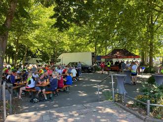 Nach zweijähriger Corona-Pause startete wieder die Drei-Länder-Radtour (04. bis 06.08.), durchgeführt von der Touristikgemeinschaft Odenwald e.V. Angeboten wurden drei Etappen, die man einzeln oder als Gesamtpaket buchen konnte. Start und Ziel war die Stadt Amorbach. Am dritten Tag machte die Tour in Breuberg Station. Auf dem, durch Bäume angenehm beschatteten, Parkplatz vor der Breuberghalle konnten die Radler ein gutes Mittagessen und kühle Getränke genießen. Neben den Fahrern konnte ich auch die Landräte Achim Brötel (Neckar-Odenwaldkreis) und Jens Marco Scherf (Miltenberg) sowie meine Bürgermeisterkollegen Thomas Grün aus Bürgstadt, Volker Oehlenschläger aus Fürth/Odw. sowie Dr. Norbert Rippberger aus der Gemeinde Mudau/Odw. begrüßen.