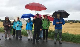 Für die tapfere Wandergruppe, die dem Regen trotzen will, ist der kleine Ramsauer-Bus ausreichend. Wir fahren nach Modau. Die Schirme werden aufgespannt, und los geht es sanft ansteigend. Vorbei am Altenheim der Gemeinde gelangen wir in einen romantischen Pfad.