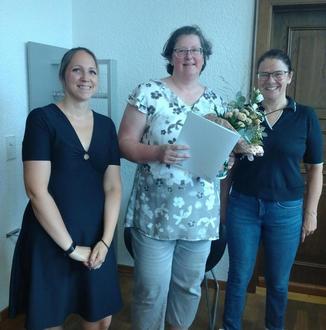 Das Bild zeigt in der Mitte die Jubilarin Andrea Gürges, rechts neben ihr Bürgermeisterin Heckler und links die stellvertretende Personalratsvorsitzende Anna Philippi.