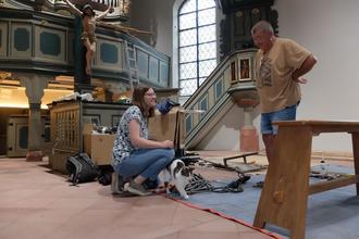 Während eine der Katzen, noch immer ohne Maus, aus der ehemaligen Grafenloge tritt, erläutern Pfarrerin Christina Meyer und Hermann Trenschel, Mitglied in Kirchenvorstand und Bauausschuss, dass bis zur offiziellen Wiedereinweihung bei der Kerb (was ja passenderweise „Kirchweih“ bedeutet) am kommenden Wochenende wohl noch nicht alles fertig sein wird. Kleine Restarbeiten sind noch zu erledigen. Aber das meiste ist geschafft, „die Kirche ist wieder benutzbar“, freut sich die Pfarrerin, die mit ihrer Familie nebenan im Pfarrhaus wohnt. Zusammen mit ihrem Kollegen Frank Couard wird sie am Sonntag, 11. August, den Gottesdienst gestalten, der um 10 Uhr in der Kirche beginnt. Der Evangelische Posaunenchor Breuberg unter Leitung von Georg Rainer Hofmann wird ihn musikalisch mitbegleiten.