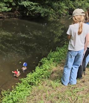 Ein besonderes Highlight war auch der Bau kleiner Flöße aus Naturmaterialien wie Ästen, Korken und Schnüren. Die kleine Flöße wurden zuerst in großen Bottichen getestet. Danach ging es zum großen Finale an die Mümling. Die selbstgebauten Miniatur-Flöße wurden dort zu Wasser gelassen und ins Rennen geschickt.